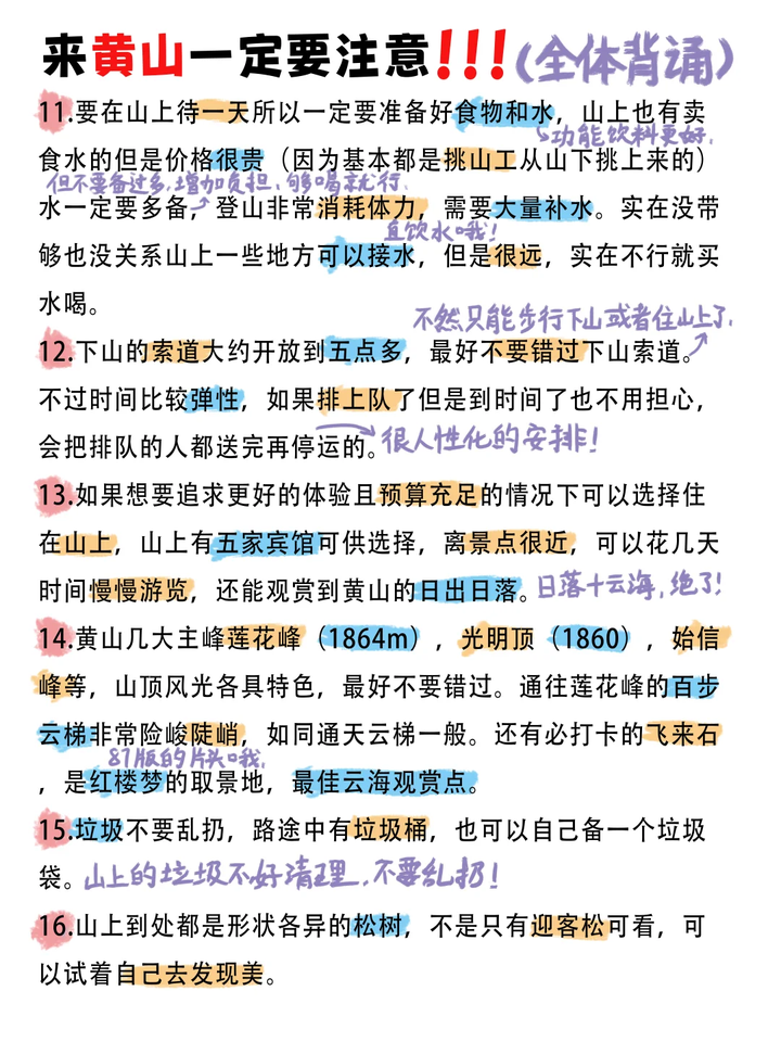 规划好路线和时间,防止赶不上下山的缆车登山杖别扔,下山可以换水,也可以留着之后几天继续用(如果感觉爬黄山很轻松当我没说,反正我是腿疼了好几天)